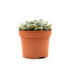 Echeveria hyalina is a neat, unshowy rosette that rewards a closer look — its slim, pointed leaves in cool silver-blue overlap in clean layers and have a faint translucent quality that catches light differently through the day. It stays small and compact for years, and produces delicate coral-tipped flowers on thin arching stems each spring.